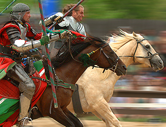 The final show of the day is a tournament of arms like those at the beginning of the 14th century. A Master of Arms coordinates the event, ensuring all proper ceremony is followed to honor the attending Renaissance faire royalty and that courtesy is maintained between the knights. Squires and pages whip the packed crowds into a fury of cheers for their favorite champion and boos for his adversaries. After the chivalric courtesies are observed, the fully-armored knights retire to opposite ends of the field and take up their lances. No tilt rail or barrier separates the combatants: “open-field” jousting allows more mobility in the arena. The trumpet sounds. The knights charge, guiding their sprinting steed with their knees as they raise their shields and lower their lances. A report like a gunshot marks their impact and one of the lances bursts into splinters as a knight is knocked backward off his galloping mount. The crowd cheers, or groans in dismay. Often, the Hanlon-Lees include mounted sword combat and ground fighting in their Joust to the Death. Fights with axes, flails, and even burning torches entertain crowds and keep them cheering for more. Over the years, knightly injuries have included stitches and a half-dozen broken bones (“Jousting is a contact sport,” quips Shelton), but despite the apparent danger, no horse has been hurt in performance in the company’s twenty-five year history. Fences and play biting have inflicted the only equine “combat scars.”